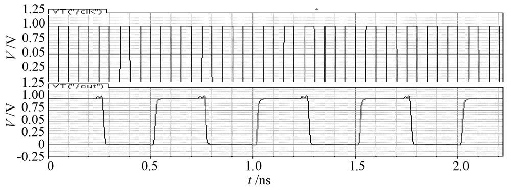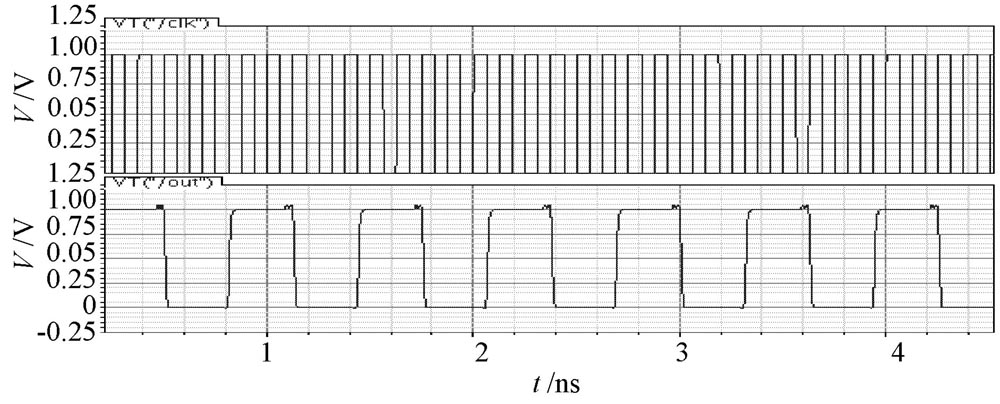 采用Cadence 公司的spect re 仿真器对设计的分频器分别仿真, 仿真电源电压为1 V, 结果表明: 在典型工艺参数条件下,基于CML 电路结构的五分频器最大工作频率是8 GHz, 最小工作频率是1 kHz, 当工作在8 GHz 时, 功耗为1. 7 mW, 输出信号占空比为49. 76% ; 基于T SPC 电路结构的五分频器最大工作频率是10 GHz, 最小工作频率是10 MHz, 当工作在10 GH z时, 功耗采用10 ns 内的平均功耗, 功耗为0. 2 mW, 输出信号占空比为49. 92%.由于是单端输入输出, 基于T SPC 电路结构的分频器抗噪声能力较弱。最高工作频率下的仿真结果如图4, 图5 所示。