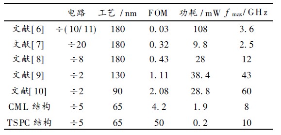 式中: fmax 是分频器的最高工作频率; P 是分频器在最高工作频率下的功耗, 表2 为本文设计的分频器和其他文献中介绍的分频器作对比,所有的分频器均采用CMOS工艺, 对比表明本文设计的5 分频器性能较优,在65 nm 工艺下具有明显的功耗低优势, 尤其是采用TSPC 电路结构的分频器, 功耗极低。