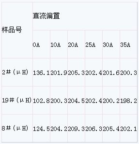 将表1所测试的电感插入恒磁片后,再加工成成品电感,取三个成品作测试样品,测试其直流特性如表2所示(测试仪表为HP4284A,测试频率为1kHz):
