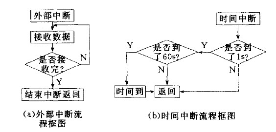 为了确保主机正常工作。加入主机等待分机回复的等待时间。而为了时间的实时性和准确性,用到单片机内部的定时器1.设定其工作模式为模式1,初值为Ox4bff(5Oms)。中断20次为1s,60次循环为60s,当60s到时,标志位置位后返回。时间中断流程图如图7(b)所示。