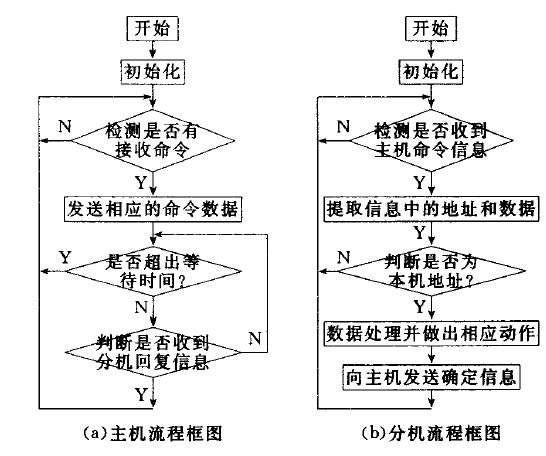 分机上电复位后进行初始化,然后等待接收主机发送的命令信息。接收到命令信息后,从中提取地址和数据信息,若为本分机地址,则对数据进行处理并作出响应,同时向主机发送确定信息;若非本分机地址,则返回,继续等待主机发送的命令信息。分机主程序流程图如图6(b)所示。