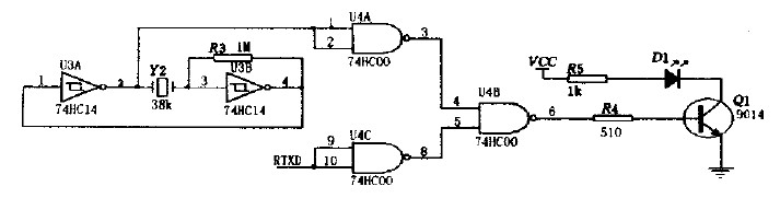 红外发送器电路如图3所示包括38kHz晶体振荡器、反相器、与非门、驱动门Q1和红外发射管D1等部分。其中38kHz晶体振荡器、电阻R3和反相器组成脉冲振荡器,用以产生38kHz的脉冲序列作为载波信号,红外发射管D1选用Vishay公司生产的TSAL6238,用来向外发射950nm 的红外光束。