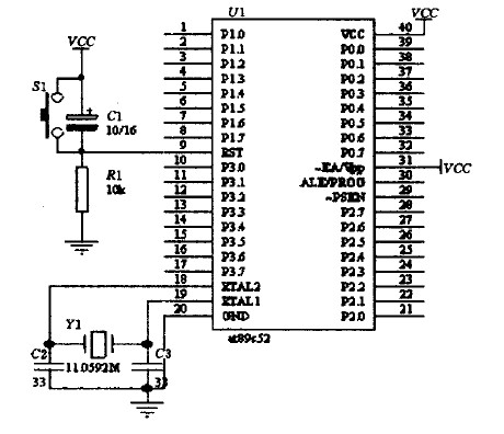 本单片机通过RS232串行通信接口与GSM ??橥ㄐ牛崛SM 设备的短信,发送相关的信息,并通过串行通信接口与红外??橄嗔?,利用红外???,达到主、分机之间的通信,因此,选用AT89S52芯片??刂粕闲枰玫搅礁龃薪涌?,但89S52只有一个串口,故还需要在程序中进行模拟串行接口通信。其最简外部接线电路如图2所示。