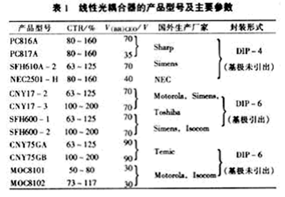 线性光耦合器的典型产品及主要参数见表1,这些光耦均以光敏三极管作为接收管。