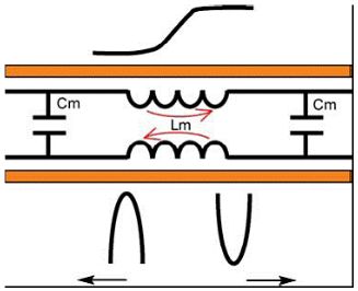 互阻抗沿着两条走线呈均匀分布。串扰在数字门电路向串扰线打出上升沿时产生,并沿着走线进行传播: