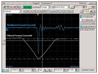 单测反向串扰时,需将干扰线与被干扰线均端接一个50 欧姆的电阻以消除反射。测量应在被干扰线的左端进行,如图9所示。反射脉冲的幅度很低,宽度是线长的两倍,因为在走线末端的串扰必定要传回走线源端。图10显示的是反向串扰的测量情况,图中快沿干扰脉冲产生的串扰约为?? mV,相当于干扰脉冲幅度的4%。反向串扰的幅度与干扰脉冲的上升时间无关。图10中,下面两个波形为慢沿脉冲产生的串扰和快沿脉冲产生的串扰经后滤波得到的波形,它们的幅度都是6.5 mV。走线线长与干扰脉冲上升时间的差距使得慢沿脉冲产生的反向串扰幅度较小。