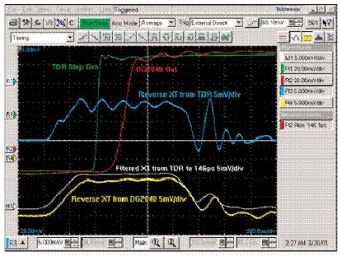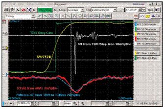 绿色波形是快沿TDR脉冲(R1),白色波形(R4)是由它导致的串扰。