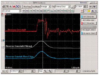 由于测量时来自80E04的输入阶跃电压具有非??斓谋哐?,因而得到的串扰过大,并不能代表实际逻辑电路中的驱动信号。例如,如果驱动信号来自一个1.5 ns的CMOS门,产生的串扰脉冲就更宽,幅度也更小。要使测量能够体现出这种情况,可利用仪器的定义算法(Define Math)功能在信号捕获之后增加一个低通滤波器。图7中的M1波形(白色)给出的就是经滤波后的测量结果。需要注意的是M1在垂直方向比未经滤波的波形敏感10倍。