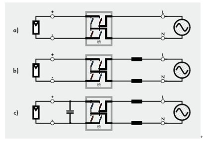 对于光伏逆变器来说,还有一个非常重要的设备不能遗漏:输入端的电容器,见图1c ) 。电容器的作用是储存电能,确保来自发电侧的电流持续一致供给桥接开关,并通过与电网频率同步变化的桥进入电网。只有在输入电容器的容量足够大的情况下,才能够保证光伏发电系统的持续、正常运行。