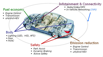 随着西方汽车市场需求的复苏以及发展中经济体车辆数目的持续增长使燃料消耗和污染不断增加,政府和制造商都在积极探索改善燃油经济性以节约能源、减少排放的途径,汽车中越来越多的电子功能也使半导体元件在车辆中的比重不断激增。面对环保和丰富消费者体验的双重挑战,半导体制造商正在利用其技术专长开发各种符合汽车规范的解决方案。