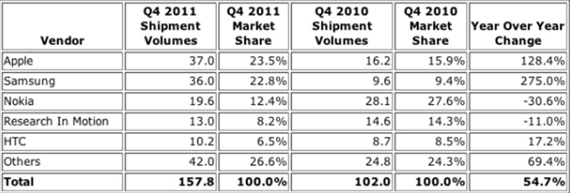 - 2011年第4季度全球智能手机销量同比增长了54.7%