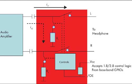 基于两个主要原因,这种设计中需要使用低导通电容的开关。首先,由于基带处理器和高速USB控制器输出共享连接器侧的相同D+/D-引脚,因此当手机进入高速USB 2.0模式(诸如音乐下载或闪存功能)时,必须降低基带USB1.1/2.0全速控制器的输出电容。D+/D-线上的任何额外电容都会损害高速USB信号的眼开度。其次,在高速USB模式时,D+/D-线上悬接的额外走线必须截除以有效避免480Mbps USB信号快速的上升/下降沿引起的信号反射。