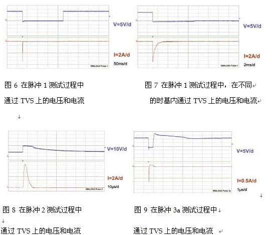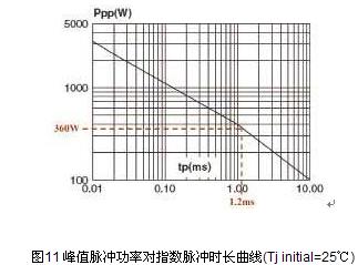 以SMAJ24A为例,从产品数据表摘取这些参数与图11的曲线进行比较,发现SMAJ24A符合ISO7637-2脉冲2测试的要求,可承受长达1.2ms的360 W指数脉冲,这个数值远远高于ISO7637-2脉冲2电涌强制的4μs时长。