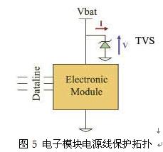 车载模块的电源线?;な窃谄祷肪持行枰刈⒌牧硪桓鑫侍?,这个问题涉及ISO7637-2标准。例如,为满足ISO7637-2标准,特别是图1中的1、2、3a和3b的脉冲要求,只使用一个瞬变电压抑制器(TVS)即可有效保护车载???。
