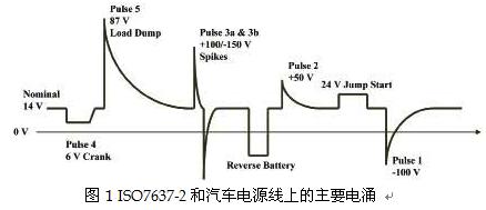 图1简要描述了ISO7637-2和汽车电源线上的主要电涌。