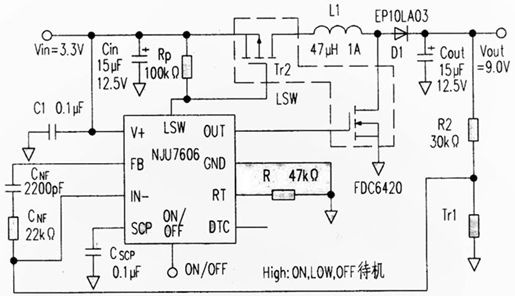 最近厂家生产出了带负载切断功能的升压型变换器IC,使用时采用图1所示的电路。在待机时借助于P沟道MOSFET Tr2的截止,切断输入端和输出端的直流通路。