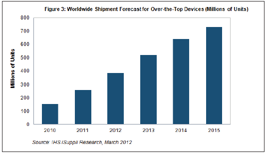 据IHS iSuppli公司的消费平台专题报告,到2015年,支持OTT的产品出货量预计将从2011年的2.58亿个增长到7.31亿个。今年支持OTT的产品出货量预计将达到3.848亿个,比2011年增长近50%,如下图所示。2011年这个OTT市场强劲增长68%。