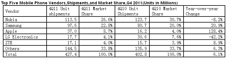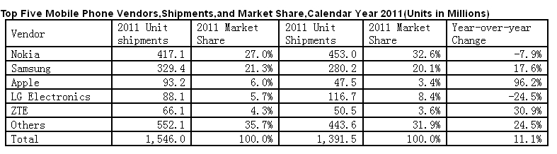 2011 年第四季度,全球共卖出4.274 亿部手机.同比去年( 4.028 亿部)上升6.1 % ,这一涨势高于IDC此前预测的4.4 % 涨幅,但低于2011 年第三季度9.3%的增幅。其中功能机的市场份额比预期的衰减速度更快,市场增幅为两年来最低。