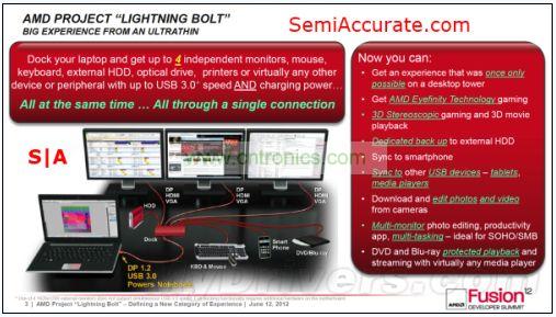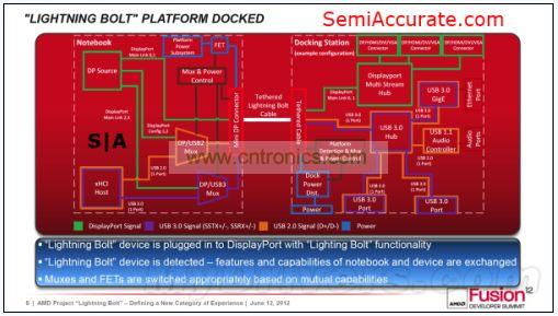 从硬件层面上看,Lightning Bolt其实很简单,驱动级的硬件兼容性使得芯片上的USB通道及APU上的DP通道用一条线缆就可以连接起来并输出到hub上。