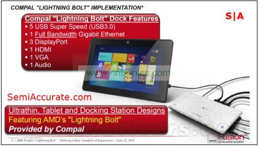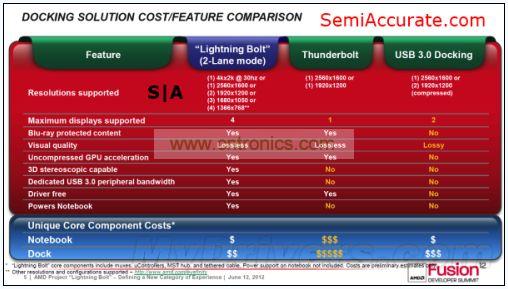 Lightning Bolt由三部分组成,分别是线缆、特殊的底座及笔记本之类的终端,听起来很复杂,但其实Lightning Bolt使用的也是标准的DP接口,理论上甚至能支持雷电接口。虽然只有一条DP通道,但是用它就可以连接Eyefinity多屏输出以及5个USB 3.0接口,这也是Lightning Bolt接口在平板及超级本这样缺少空间提供又大量接口的设备上存在的意义。