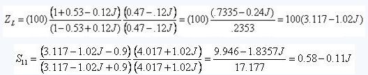 举个例子,用100欧姆阻抗表征的复合回波损耗S11=0.53-0.12J转换到90欧姆的如下: