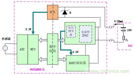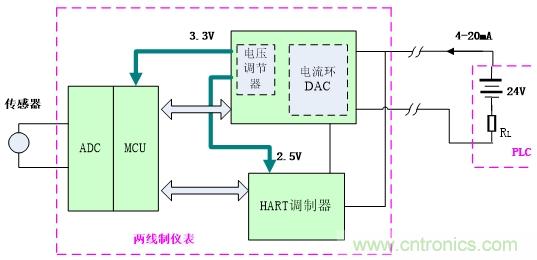 图一的电路中,传感器的信号经过ADC转换成数字信号,再经MCU发送给电流环DAC及HART调制器,形成4-20mA的信号输出,电流环DAC从PLC输出的4-20mA总线上取电,经内置的电压调节器输出3.3V及2.5V,给MCU及HART调制器提供少量的电源。