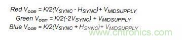 AD8147根据以下公式提供额外的特性,以编码TTL逻辑电平、三路输出共模电压(VOCM)上的水平和垂直同步脉冲信号: