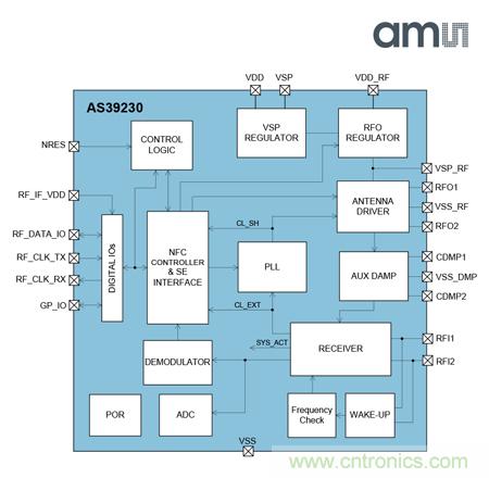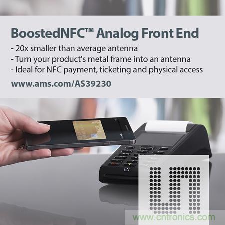 ams的新AS39230可提升天线信号质量,从NFC标签、卡或卡仿真器向NFC读写器发送信号,AS39230的信号强度是采用传统无源负载调制(PLM,passive load modulation)方法的10倍。在空间受限的设计中,天线尺寸可缩至二十分之一,面积仅为100mm2或更小,同时可以保持信号强度不变。AS39230甚至准许产品的金属壳充当天线,将NFC天线所需的电路板空间及相关成本降至零。