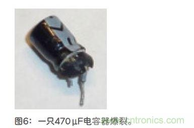接着我用仪表检测输出电压。在继续阅读下文之前,请回头看一下图2。你是否注意到最左边那个紧邻USB连接器的470μF电容器?我的手指擦过这个电容器,觉得很烫。然后我听到呼的一声,发现电容器爆裂开来,封装的底端飞弹出去,见图6。
