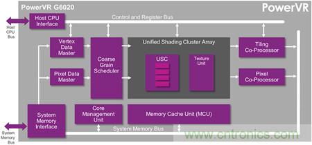 新款PowerVR G6020 GPU是专为能以超小硅晶面积实现绘图功效而设计,能获得更佳的真实装置性能与兼容性,却无需不必要的额外开销。它是PowerVR Series6XE系列产品中尺寸最小的成员,具备四个算数逻辑单元(ALU)内核,硅晶面积仅2.2mm2 (28纳米制程,400MHz)。为达到此目标,G6020具备一个特别为UI体验设计的高度优化的统一渲染集群(USC)引擎。此特别配置的新款USC可在最小的面积与功率预算内实现最佳的特性组合,并能与其它的Rogue USC完全兼容。
