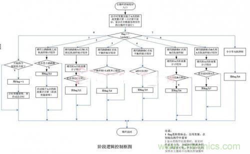 系统框图如图3所示,主控循环程序每隔一个采样周期从FPGA接口中读取各个传感器的数值,并经过处理后获得小车的运行状态,根据小车的当前状态采取相应的控制算法计算出电机所需的控制电压值,进而,该控制电压值经过PMW处理后输出到小车驱动电机,使小车按照希望的规律运动。为了使程序流程清晰简洁,框图中以一个标志信号来记录小车所运行的阶段,控制器则根据小车所处的运行阶段进行相应的控制。
