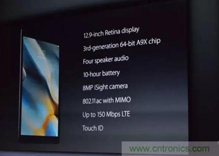 iPad Pro采用了12.9存屏幕,宽度和iPad Air的长度一样,分辨率高达2,732*2,048,拥有560万像素,比MacBook Pro还要高。后置800万像素摄像头。iPad Pro搭载A9X处理器,拥有了桌面级的处理器性能,速度是A8处理器的1.8倍,内存带宽是A8X的2倍。同时在机身四周配置四个扬声器,是iPad Air 2音量的三倍。苹果声称iPad Pro比80%的笔记本电脑的处理速度都要快。新款iPad Pro的CPU处理能力是初级iPad 22倍,图形处理能力是初级360倍。