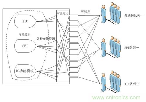 实际FPGA内部并不像图2那么简单,这里只是为了形象说明可编程IO可以使内部逻辑和PCB可以相对独立设计。对于同类接口,不必因为PCB改变而更改时序逻辑,只需要更改引脚分配,大大简化了PCB的布线难度。