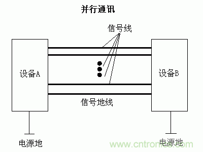 并行通讯通??梢砸淮未?bit、16bit、32bit甚至更高的位数,相应地就需要8根、16根、32根信号线,同时需要加入更多的信号地线。比如传统的PATA线路有40根线,其中有16根信号线和7根信号地线,其他为各种控制线,一次可以传送2Byte的数据。并行通讯中,数据信号中无法携带时钟信息,为了保证各对信号线上的信号时序一致,并行设备需要严格同步时钟信号,或者采用额外的时钟信号线。