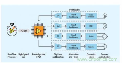图2 - NI LabVIEW的可重配置I/O(RIO) 架构基于四大组件之上:如处理器、可重配置FPGA、??榛疘/O硬件和图形设计软件。