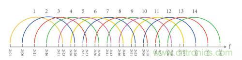 Wi-Fi在802.11b/g的标准的工作频段为2.4GHz(2.4GHz-2.4888GHz),划分为14个信道,每个信道带宽为22MHz,Wi-Fi频谱列表如下所示: