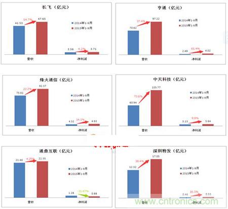 图表6:2015年前三季度国内六大上市光纤光缆企业市场表现