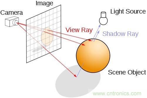 而反向追踪方式则是计算最终射入我们眼睛的光线的反向光路,即眼睛—物体—光源的过程。因为这么做的话,可以省掉很多并不需要计算的光路,在光线追踪中,并不是每一束光都有用。有些光最终并没有射入我们自己的眼睛,但是如果依旧计算的话就会造成不必要的计算资源浪费。在光线追踪中,光同样也被分类,假设一条主光线是不可见的,那么系统则会抛弃掉整条光路,如果可见的话,那么辅助光线(反射,折射,阴影)的计算就开始了。在完成主光线的判别之后,辅助光线的其他属性(透明度,色彩)操作也已经基本完成了。