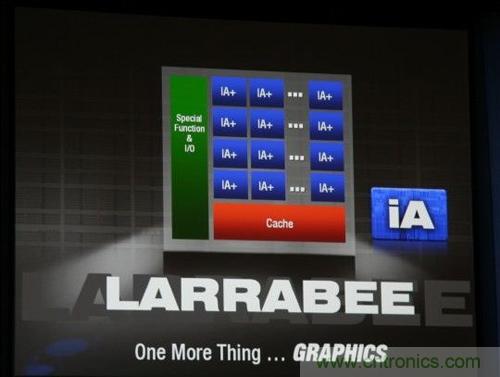 在2007年的IDF上,Intel正式揭开独立显卡——代号“Larrabee”的神秘面纱,Larrabee隶属于其万亿次运算项目(Tera-scale),也将是Intel的第一款实用级万亿次运算处理器,其处理能力“大大超过”一万亿次浮点每秒;根据Intel首席架构师EdDavis的演示文稿,Larrabee基于可编程架构,主要面向高端通用目的计算平台,至少有16个核心,主频1.7-2.5GHz,功耗则在150W以上,支持JPEG纹理、物理加速、反锯齿、增强AI、光线追踪等特性。