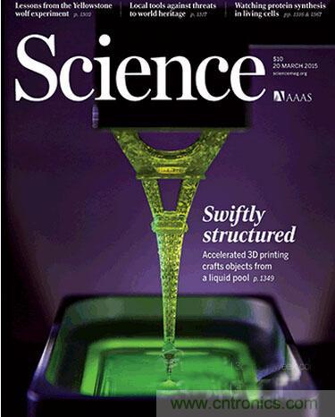 这些神奇的动图都出自最近发表在《科学》(Science)上的一篇有关3D打印技术的研究论文。这种新技术显然也征服了期刊的编辑,在期刊封面上都出现了这个从液体中打印出来的“倒立铁塔”的身影。那么,这种液体3D打印技术究竟有什么过人之处?球和塔又是怎么从液体里“拉”出来的呢?