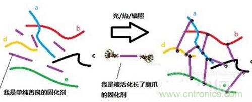 在图中,小a、小b、小c等等是一群活泼的聚合物分子,因为这些链状的分子之间很容易相互移动,所以看上去是一滩黏黏的液体(有时候可能粘度很大,比如硫化前的天然橡胶,它从树上滴下来的速度非?;郝S幸惶於衲О岩话训ゴ可屏嫉墓袒粱旖诵⌒值芾锩?,小兄弟活泼依旧,丝毫没有发现危险的存在。突然有一天恶魔把这滩小兄弟连固化剂一起放进了高温高压的一个东西里面(一般称为硫化机/热压机),然后看似无害的固化剂长出了魔爪,死死抓住了小兄弟们,一个又一个的魔爪分别抓住不同的兄弟们,产生了很多交联结构,即使没有了高温高压也不会再放开。最后小兄弟们再也不能随便活动了,这滩液体也变成了硬硬的一块——这就是固化过程的通(dou)俗(bi)解释。当然也有些固化剂的固化原理是引发小分子聚合物上的基团相互反应的,这种一般被称为引发剂。