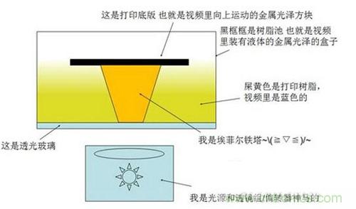 简单来说,立体光固化的过程就是光照射光敏树脂表面,使其固化成薄薄的一层固体,已经固化完成的部分被一块基板黏附着,逐渐与光照射面拉开一定距离(通常是每次移动十几个微米),然后在上一层固化树脂的基础上再进行下一层的照射和固化。经过层层固化叠加之后,最终就形成一个完整的立体结构。下面这张图表示的就是SLA设备的基本结构,固化反应发生在打印树脂与透光玻璃板的交界面上,由于光照射面在液面的下方,打印的过程看上去就像从液体里“拉”出了打印制件一样。