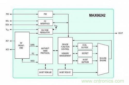 几种功能对于无线NFC/RFID应用非常重要:集成到无源标签认证器的高级安全性(图2)、集成无线NFC/RFID接口和I?C接口、数据保护模式、高速数据传输、标签能量收集;MAX66242集成了SHA-256加密引擎,提供基于安全密钥的对称式质询-应答安全认证。是控制NFC/RFID读卡器与那些设备通信,以及如何与MAX66242通信的最好途径。32字节SRAM缓存器有利于通过I?C接口进行高速数据传输。标签上的能量收集引脚VOUT使其利用天线从读卡器的HF场收集能量。