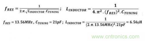 式1. PCB上集成的外部天线电感(LINDUCTOR)必须与标签的内部调谐电容(CTUNING)相匹配,使电路谐振点为13.56MHz。