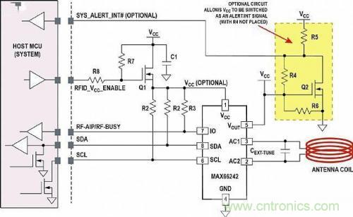 图4中,I?C接口(SDL和SDA)和PIO信号(RF-AIP和RF-BUSY功能的多路复用线)是连接主机微控制器所必须的,RFID_VCC_ANABLE和SYS_ALERT_INT#信号可选。MOSFET Q1用于隔离。由于可通过RF和I?C接口访问标签内部的EEPROM,当主机微控制器必须在存在HF场的情况下进行连接时,Q1为标签供电。然而,可选的Q2利用电路板上的稳压VCC切换开漏SYS_ALERT_INT# (这种情况下不安装R4)。