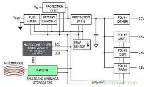 设计者可利用MAX66242储存对系统运行至关重要的诊断和故障数据。在系统“死机”后或未上电时,可上传该数据。这种系统健康和故障数据的收集是通过NFC/RFID标签的接口实现的。图7所示为典型的电源管理系统,其中每个负载点(POL)稳压器由公共电源管理总线(PMBus)进行配置和监测。PMBus仅仅是I?C总线的一种变体。系统正常工作期间,持续监测每个POL的关键工作参数。在持续监测模式下,系统管理器也可执行修正措施,以响应故障或工作报警。