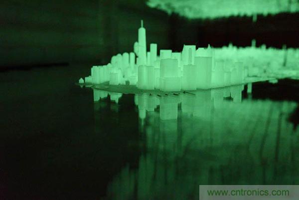 这些城市街区是用3ds Max和Rhino软件设计之后,再用能够在黑暗中发光的半透明线材3D打印的。这其中的每个模型都经过了精心设计使之尽可能地与真实保持一致。除此之外,Huang还会偶尔在个别细部的地方秀一下自己的幽默感,比如他就3D打印了一个金刚并将其放到了自由塔上。