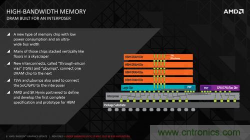 有了先进工艺的采用,虽然我们只得到很少的信息,但可以确定Nvidia和AMD的最新架构将在所有的在图形处理中实现全新的内核逻辑。两种架构都将实现高带宽的存储,并集成在GPU封装中,如下图所示。