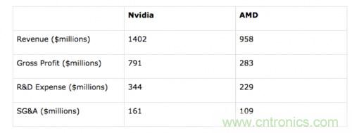 另一个重要的优势是,Nvidia公司的财务实力在恢复。目前Nvidia是盈利的,并有望在研发中比AMD投入更多的的资金,而此前则不得不削减营运费用。下面的表格提供了两家公司最新一个季度的财务状况比较: