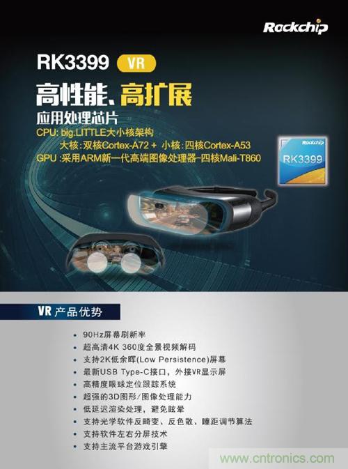 据了解,目前瑞芯微Rockchip旗下主流芯片RK3288,应用于VR产品,已经具备其曝光的所有技术优势。已在VR产业链颇具建树,在2016年的CES展及本次香港展,多家品牌终端厂商采用了该入门级VR方案并进行了展示。而最新发布的RK3399处理器,更定于中高端VR产品线,在硬件配置上提升巨大。